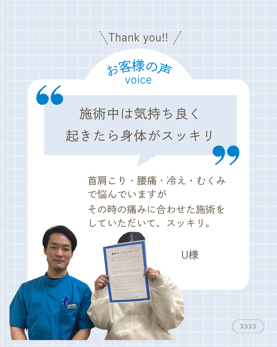 鍼灸自体は初めてではなかったんですが、明らかに体の不具合が改善されてる感が即時に感じられて驚きました